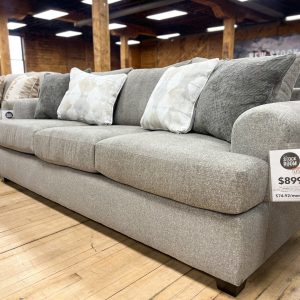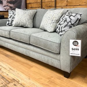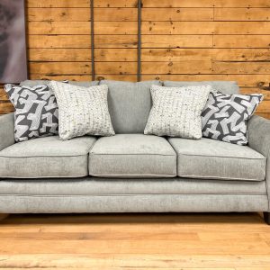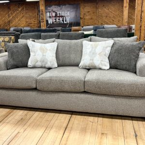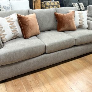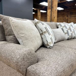 Made in the USA. Built in Mississippi. Plush three seat sofa with extra wide arms in a super cozy taupe-colored fabric. An updated style that’s very warm and welcoming. Includes two throw pillows, as shown. Built with a solid hardwood frame. Matching loveseat sold separately, while supplies last. MEASUREMENTS: W91″ x D36″ x H40″