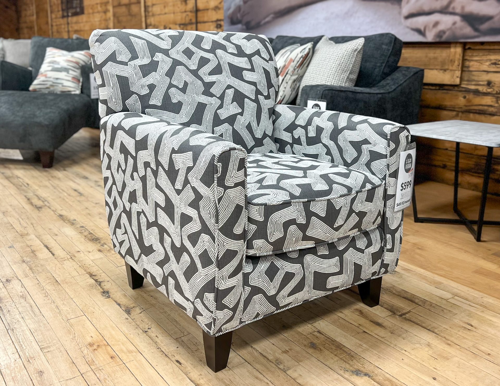 This boldly printed arm chair is designed for superior comfort and style, making it the perfect accent piece to your room. Upholstered in a fun black and white printed fabric and resting on tapered wooden legs, this chair blends bold style with classic craftsmanship.