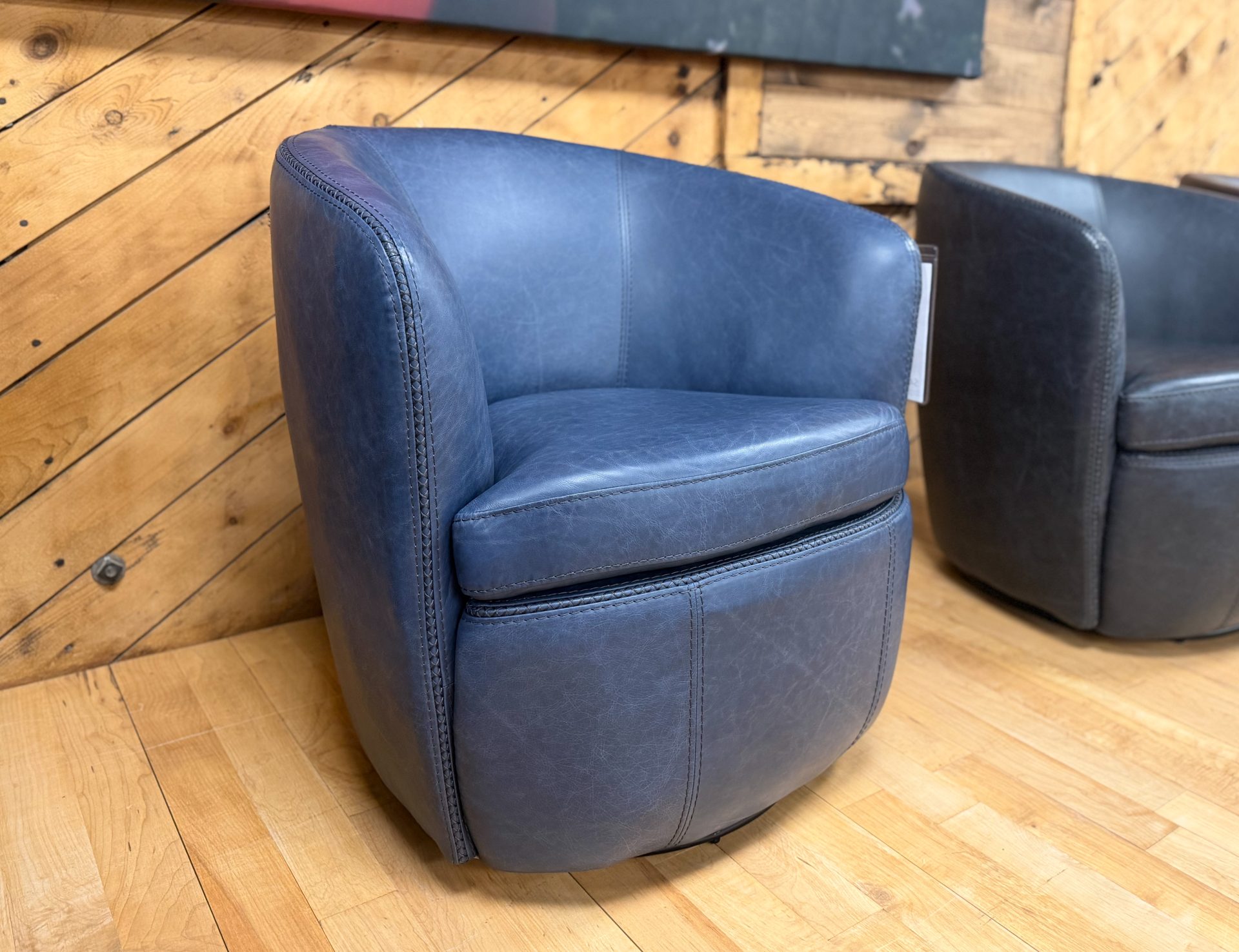 Made in the USA. Built in California. Lean back and relax in this swivel club chair in vintage navy. This chair combines smooth, effortless 360-degree swivel motion, making it the perfect spot to relax. This chair offers the texture and elegant appearance of leather, while being easy to care for and maintain. The neutral hue complements any décor, adding a touch of modern sophistication to your space.