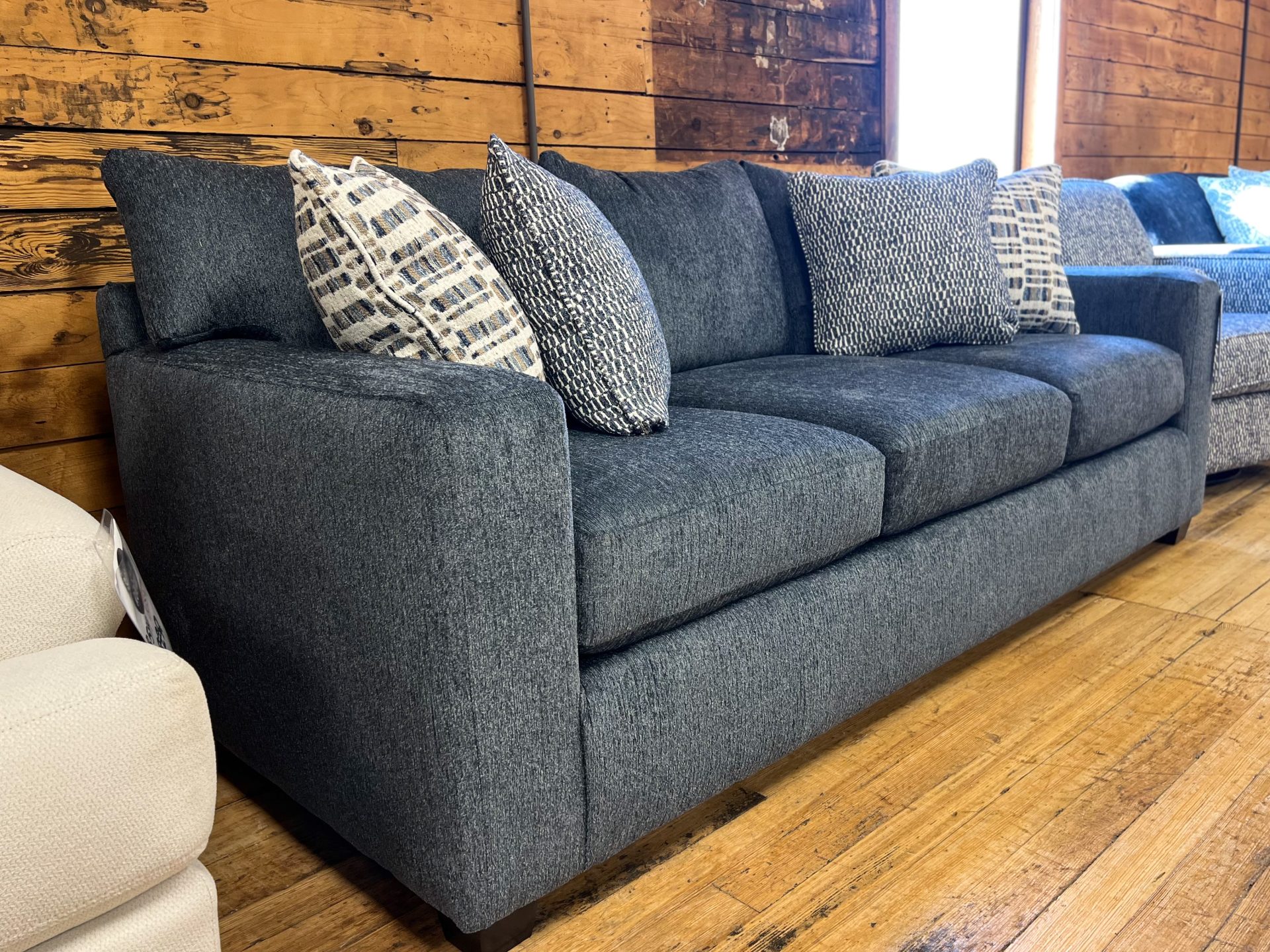 This textured modern three seat sofa is designed for superior comfort and style, making it the perfect center piece to your room. Upholstered in a cozy blue printed fabric and resting on tapered legs, this sofa blends bold style with classic craftsmanship.