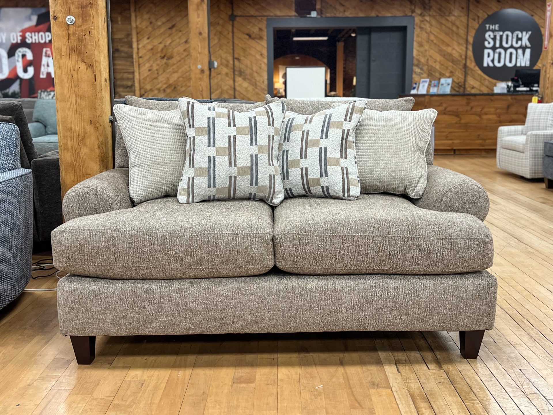 This premium Contemporary Rolled Arm Loveseat is designed for superior comfort and lasting durability, making it the perfect accent piece for your living room. Upholstered in a sophisticated Truffle fabric and resting on tapered wooden legs, this loveseat sofa blends modern style with classic craftsmanship.