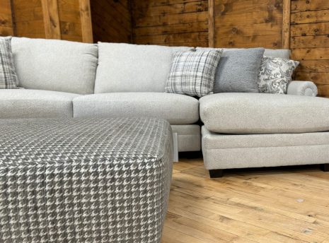 Made in Tennessee. Large transitional sectional with woven grey upholstery. Timeless and complements all decor, this lovely piece will fit perfectly into any space. Built with premium comfort gel seating and sturdy Steel Tech frame. Comes with nine throw pillows, as shown. Oversized ottoman in classic houndstooth fabric sold separately.