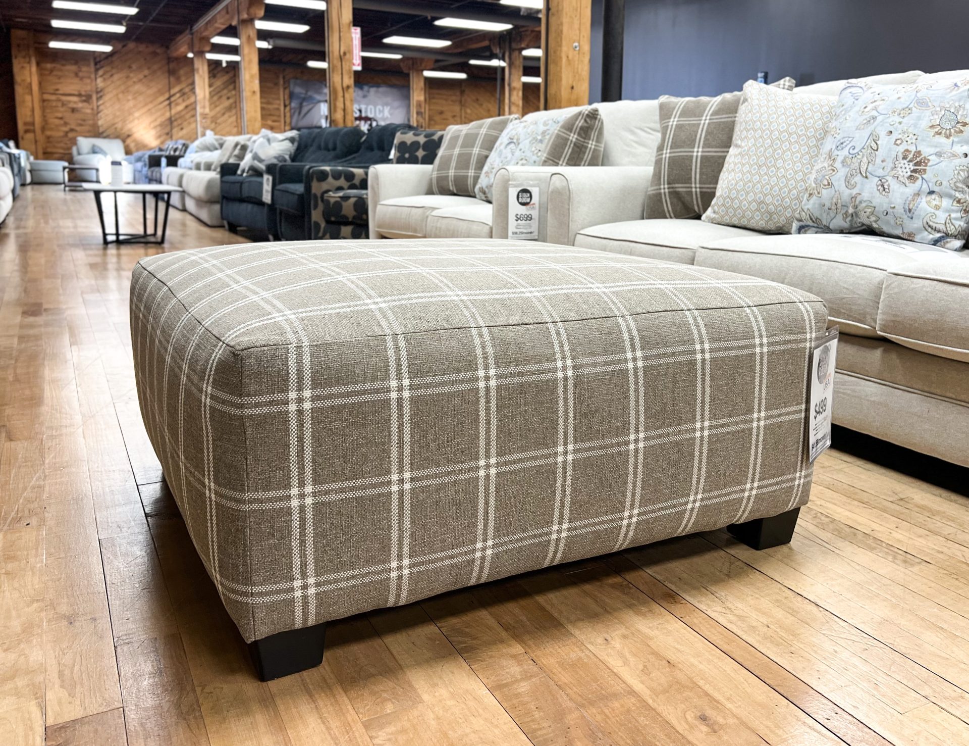 Add the perfect finishing touch to your living room with the Magnolia Ottoman. Proudly made in the USA (Tennessee), this oversized ottoman is designed to match the Magnolia Sofa and chair. It features a classic, warm-toned plaid upholstery that adds texture and a cozy farmhouse feel to any space.