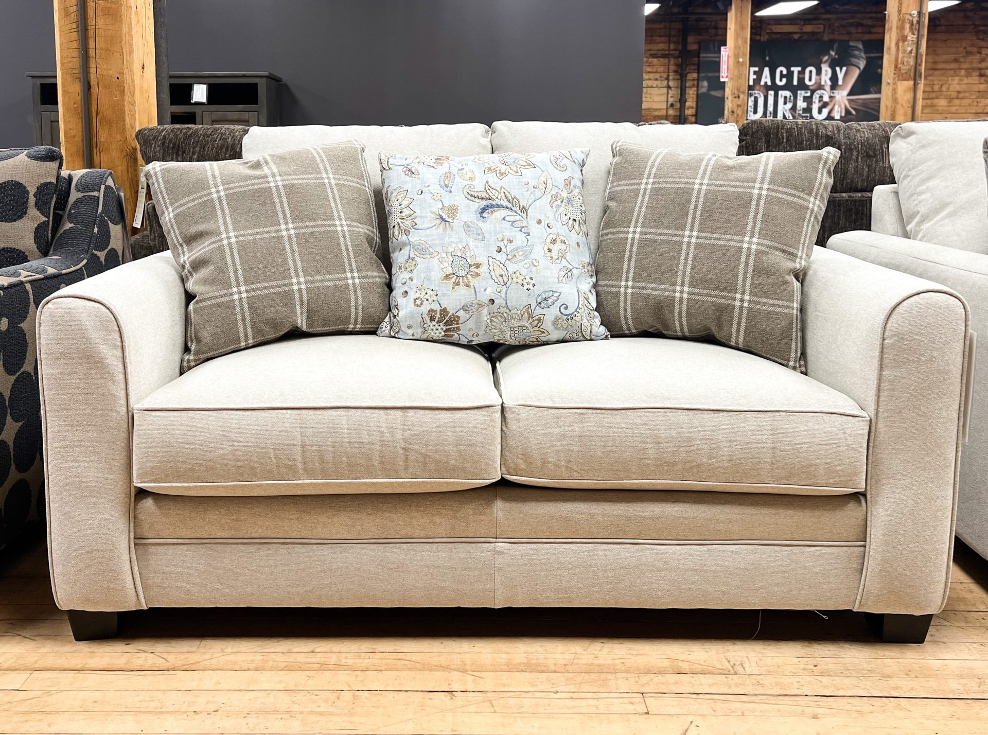 • Stylish Accents: This loveseat comes with three coordinating throw pillows—two in a classic plaid and one in a beautiful floral pattern—to effortlessly complete your decor.
