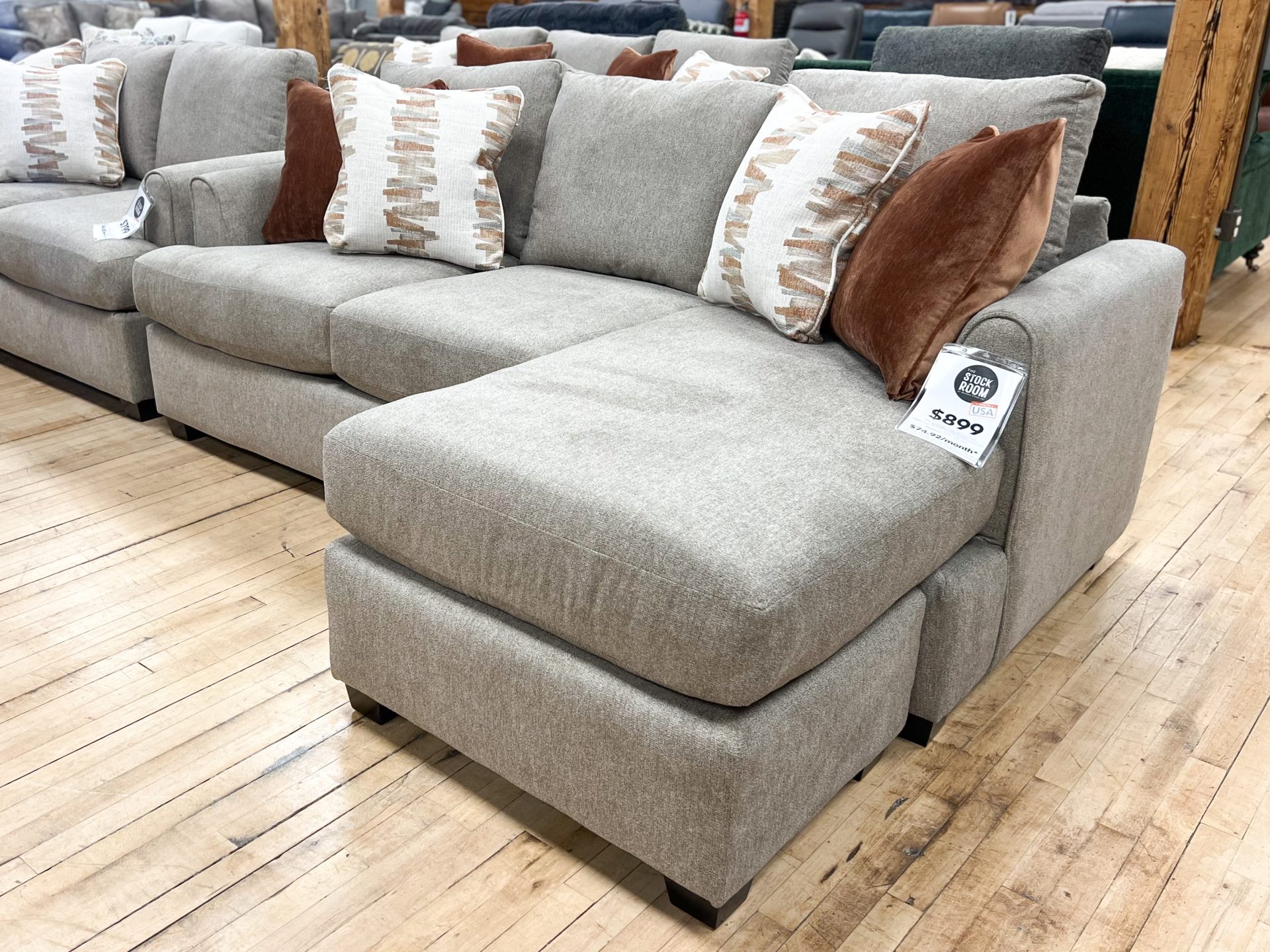 Elevate your living space with the inviting charm of this Mississippi-crafted sectional. This beautifully designed piece, made with local craftsmanship, seamlessly blends comfort and style. The neutral fabric provides a versatile foundation, effortlessly complementing any home decor, while the four included accent pillows add a touch of personality and visual interest.