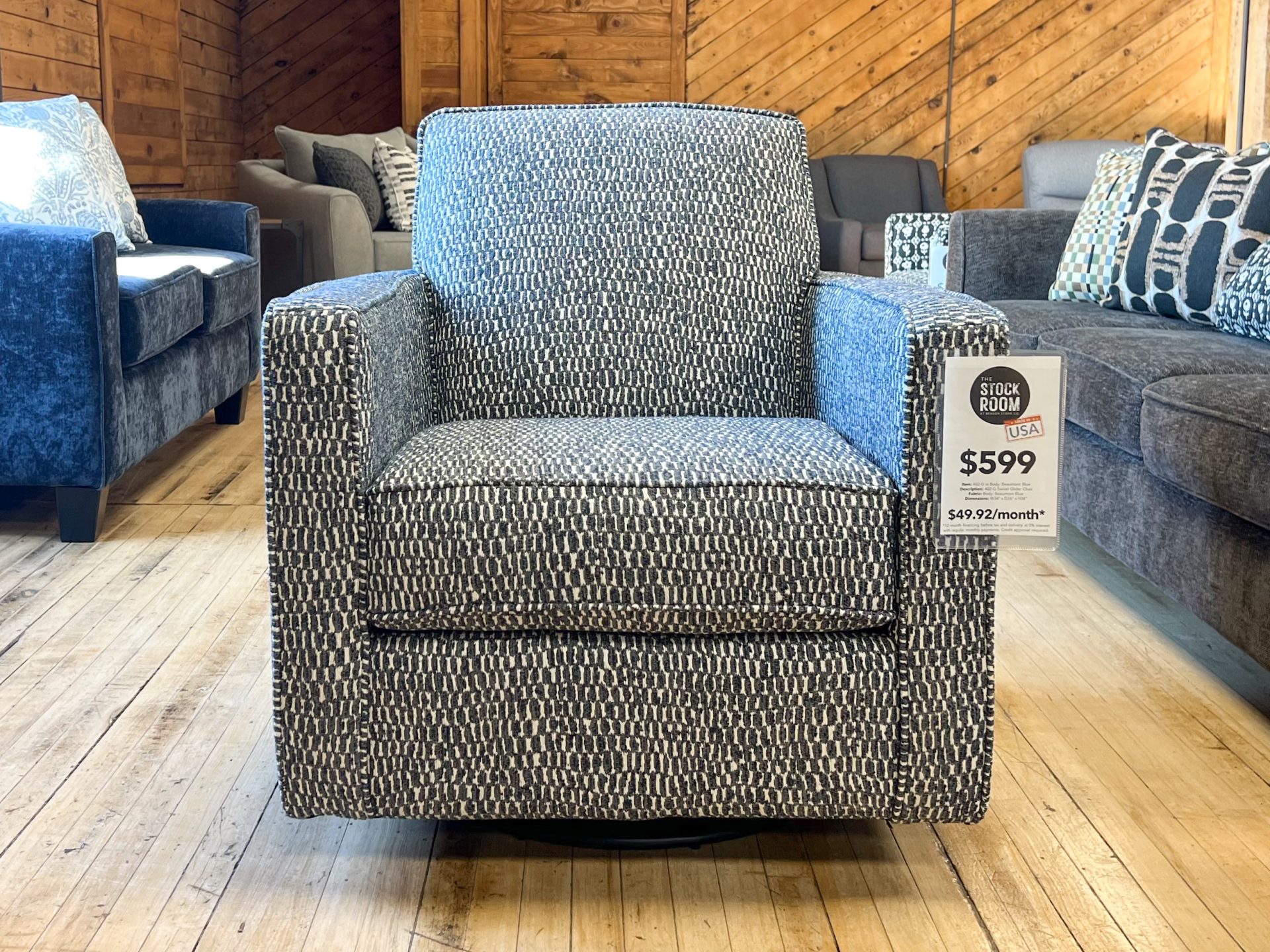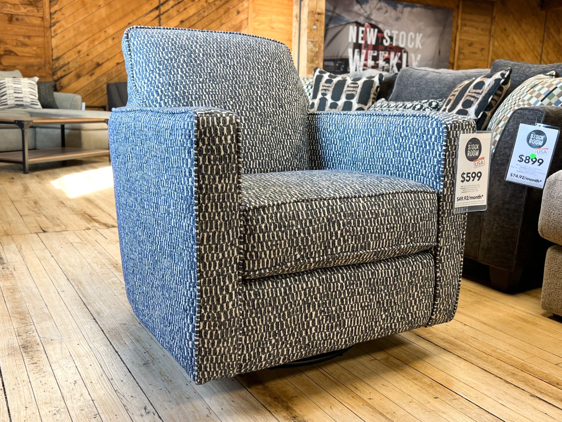 This textured abstract swivel chair is designed for superior comfort and style, making it the perfect accent piece to your room. Upholstered in a fun blue and white printed fabric and resting on a swivel, this chair blends bold style with classic craftsmanship.