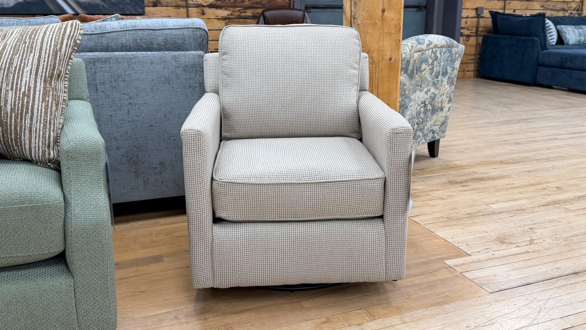 The chair is shown here in a versatile neutral pattern that effortlessly complements a wide range of styles, from modern rustic to traditional.